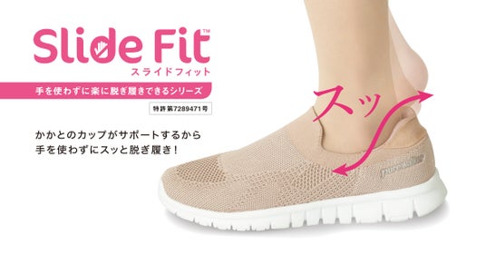 Slide Fit(スライドフィット)とは当社が特許を取得しているハンズフリー機能の名称です。ハンズフリー機能とは手を使わずに靴の脱ぎ履きを可能にする機能で、かかとのカップが靴の脱ぎ履きをサポートすることで、手を使わずにスッと靴を脱ぎ履きすることができます。