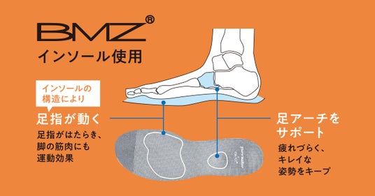 インソールの構造により足指が動き、足指がはたらくことにより、脚の筋肉に運動効果を発揮します。さらに、足裏のアーチをサポートすることにより、疲れづらく、キレイな姿勢をキープすることができます。