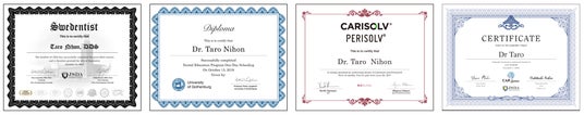「スウェデンティスト認定証」「イエテボリ大学日本スクーリングディプロマ」「カリエスプロ・ペリオプロ・ソルブプロ認定証」「キャップシステム修了証」