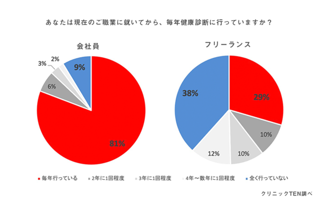クリニックTEN渋谷は、関東在住のフリーランス/個人事業主を中心に健康診断に関するアンケート調査を実施。調査の結果、4割のフリーランスが健康診断を全く受診していない結果に。その理由は「予約が面倒」が最も多く、「申し込み方が分からない」という声も多数。調査の結果、年々フリーランス人口が増加する中、健康診断の受診を含めたフリーランスの健康を支えるインフラが整っていない課題が浮き彫りに。調査結果を反映し、予約がWEBで簡単に行え、健診も個室でスピーディーに完結する「30分健診」をリリース。クリニックTEN渋谷では、フリーランス/個人事業主の健康維持やリテラシー向上を目的とした取り組みも行っており、今後も業界や世の中の変革のさなかで健康・医療サービスが十分に行き届いているとは言えない方々へのフォローを拡げていきます。
