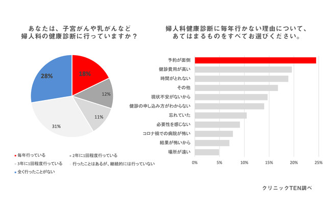 子宮がんや乳がんといった婦人科検診を行っている割合は3割ほど。予約が面倒に続き、「健診費用が高い」「時間が取れない」といった声も。