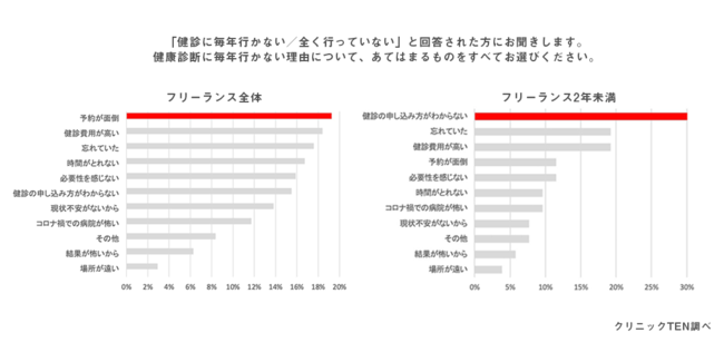 自分で病院を探し、予約を行う必要性のあるフリーランスの健康診断は「予約が面倒」なことが最大のネック。フリーランス2年未満は「申し込み方がわからない」が最多の結果に。
