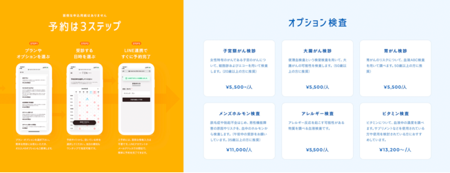 オプションとして、婦人科検診やがん検診、アレルギー検査なども受診可能。