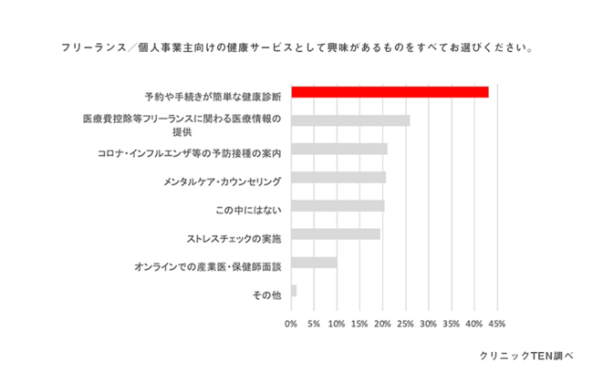 日々忙しく働くフリーランスにとって、「予約や手続きが簡単な健康診断」を求めるという結果に。また、医療費控除やセルフメディケーション税制など節税になる制度の情報など、「フリーランスに関わる医療情報の提供」も求められています。