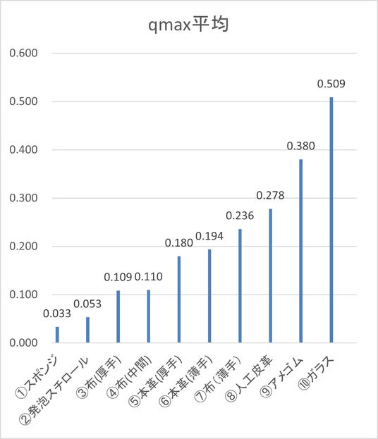 KES-F7サーモラボを使用し、qmax値(肌が触れたときに感じる「冷たい」や「温かい」を評価する指標、熱流量ピーク値)を測定。素材によって、肌からサンプルへの熱の移動量は異なり、移動量の最大値を示しています。数値が高いほど、冷たく感じる素材ということが分かります。
