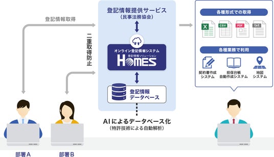 登記情報の活用と業務コストの削減を目的に開発されたクラウドサービス。登記情報をオンラインで一括取得することが可能で、システム内で登記情報を共有できるほか、二重取得を防止できるため、無駄な経費の削減可能。特許取得済のホームズAIが登記情報を取得と同時に解析し、CSVやExcelへデータ化するため、手入力による転記ミスがゼロとなるなど、大幅な業務効率化が実現できるシステム。