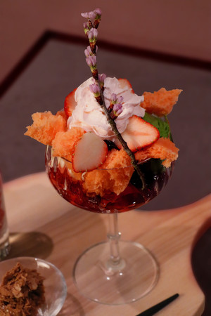 軽く仕立てたココナッツと桜風味のホイップクリームに、酸味のあるグリオットチェリーとイチゴが散りばめています。プルンとした食感の桜ゼリー、フワッと桜香る桜スポンジなど、様々なテイストが見事に溶け合う一品になっています。これからの春の季節に、グラスの中でもお花見を楽しんでいただけるパフェに仕上げました。