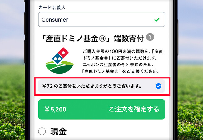 この度、Adyenとの共同プロジェクト実現により、2023年5月22日からは、ドミノ・ピザのどのピザを購入しても、お客様は任意で「産直ドミノ基金(R)端数寄付プログラム」に参加し、日本の生産者を応援することができるようになりました。