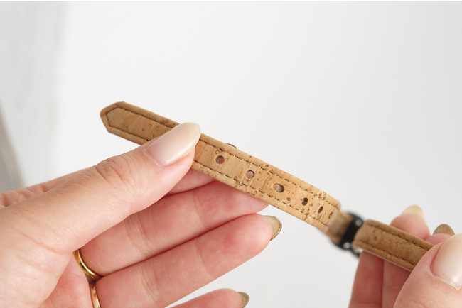 首輪の外側は、超軽量で水に強い特徴を持つ「アップルレザー」を使用。万が一水をこぼしてしまっても、サッと拭くだけでお手入れが完了します。また、内側には肌当たりが優しい「コルクレザー」を採用。初めて首輪をつける猫ちゃんも、違和感なく着用いただけます。