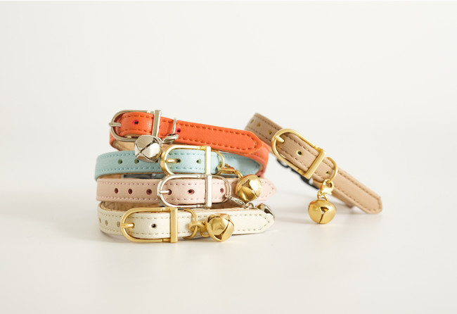 カラー展開は全5色。それぞれのカラーに合わせて、シルバーとゴールドの金具を採用しています。さまざまな毛色や瞳の色を持つ猫ちゃんに対応できるカラーラインナップにこだわりました。