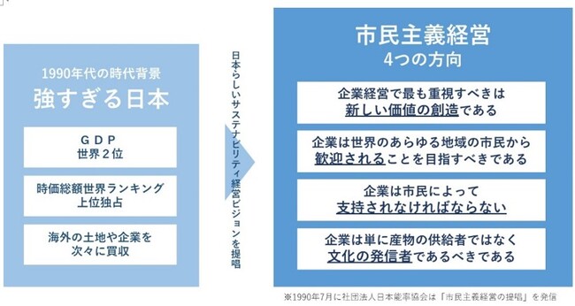 1990年7月に日本能率協会グループである社団法人日本能率協会(当時)は、時代に先駆けて、サステナブルな経営の4つの要諦を「市民主義経営」とし提唱いたしました。