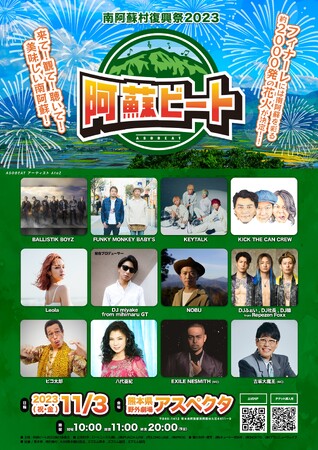 「新たな南阿蘇村を世界へ!音楽劇場アスペクタを舞台に、miyake氏(mihimaru GT)による総合プロデュースにて2023年11月3日(金・祝)に初開催される野外フェスイベント「阿蘇ビート2023」。本イベントにて音楽と食を通じてエシカルビレッジ"南阿蘇"を多くの方にご体感いただき、2016年熊本地震にて甚大な被害を受けた南阿蘇村の復興を新たなフェーズへと進めていきます。