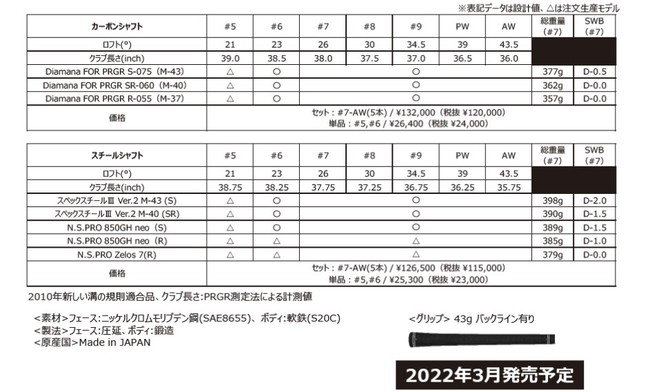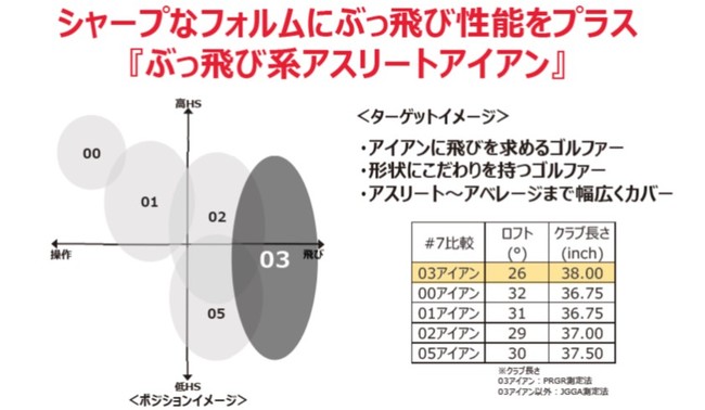 (株)プロギアは、構えやすさ、打感、飛距離性能、コントロール性、やさしさといったアイアンに求められる性能を追求した「PRGR IRONs(プロギア・アイアン)」から「PRGR 03 IRON(ゼロサン・アイアン)」を3月18日から発売致します。飛距離性能とシャープな形状、心地よい打感を併せ持つアイアンとなっています。
