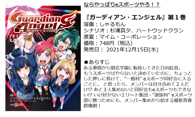 株式会社マイム・コーポレーション(本社:東京都台東区、代表取締役社長:岡田政夫)は2022年01月19日(水)、マンガBANGコミックスより「eスポーツ×女子高生」の部活青春ストーリーである『ガーディアン・エンジェル』が各電子書籍ストアにて電子単行本第一巻を発売したと発表しました。また、新章突入となる第七話より元プロプレイヤーiSeNNが漫画の監修に参画。さらに『ガーディアン・エンジェル』の公式Twitterが開設しました。