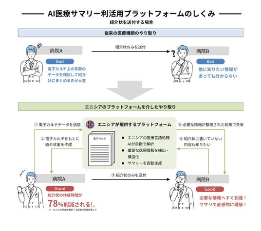 医療向けAIソフトウェア開発を行うエニシア株式会社(本社:京都市左京区、代表取締役:小東茂夫、以下、エニシア)は、医療機関に蓄積される電子カルテの自由記述(非構造化データ)をAIが自動で解析・構造化し、利用者の目的に応じた最適な形で情報を提供する「AI医療サマリー利活用プラットフォーム」に関する特許を取得しました。本技術は、地域医療連携の際に生じる“カルテを読み解く負担”を大幅に軽減し、臨床現場における情報共有の質とスピードを向上させることが期待されます。