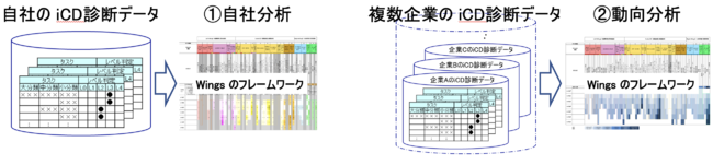 一般社団法人iCD協会(東京都千代田区、理事長:金 修)は、iCD(※1)を活用している企業が保有するタスクを主体とした診断データ(以下、「iCD診断データ」)を提示して頂けると、それらのデータをWings(※2)を主としたフレームワーク(※3)にマッピングし、データバーやヒートマップの手法を活用して、自社の業務遂行力の位置づけを可視化するサービス(以下、「フレームワーク分析サービス」)を、今秋から提供の予定にしていることを発表いたします。