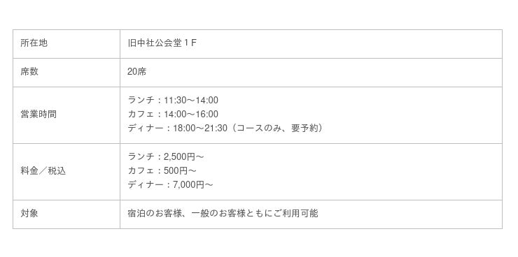 第一弾は、かつて公民館として使われていた「旧中社公会堂」を再生したホテル「RITA 戸隠」とフレンチレストラン「awai」を2023年4月28日に開業します。今後、第二弾として元茅葺民家を一棟貸し宿に再生し、2023年中に開業予定です。