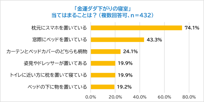 「あなたの寝室は『金運が下がる寝室』に当てはまりますか?」と聞いたところ、「枕元にスマホを置いている」(74.1%)が断トツの1位でした。これは近年、スマホ依存率が増加していることや目覚まし時計代わりにしている人も多いため、このような結果になったと考えられます。2位は「窓際にベッドを置いている」(43.3%)で、3位は「カーテンとベッドカバーのどちらも柄物」(24.1%)となりました。