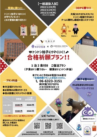 大和大学(所在地:大阪府吹田市、学長:田野瀬 良太郎)は、コロナ禍における地域との取組みとして、11月の学校推薦型選抜入試(公募制)の受験生を対象に「大阪コロナホテル」とコラボレーション企画を実施、第二弾として、大和大学の一般選抜受験者を対象に受験生応援プラン「トントン拍子にうまくいく!合格祈願プラン」を販売します。