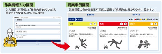 入力は「天候」と「作業内容」といった最小2項目の入力により災害事例を提案します。事例は、写真や色分けを用いて直感的に確認できるため、現場でも負担なくご利用いただけます。