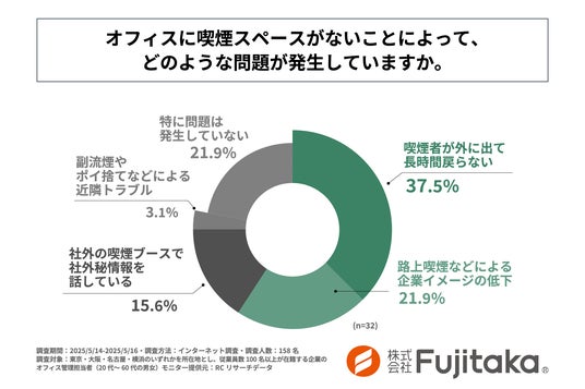 次に、オフィスに会社としては喫煙スペースを用意していないと回答された方に「オフィスに喫煙スペースがないことによって発生している問題」を尋ねる設問の回答では、1位が「喫煙者が外に出て長時間戻らない」で37.5%、2位が同率で「特に問題は発生していない」と「路上喫煙などによる企業イメージの低下」で21.9%という結果になりました。