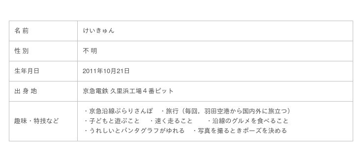 「けいきゅん」は1000形のボディーにつぶらな瞳の人気者!京急沿線のぶらり散歩や,子どもと遊ぶのが大好き。趣味は旅行で、羽田空港から国内外へ旅立ちます。