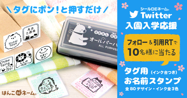 入園入学準備で大変な衣類の名前付けを楽にするタグ用お名前スタンプが、公式Twitterをフォロー&指定のツイートを引用リツイートするだけで抽選で10名様に当たります。