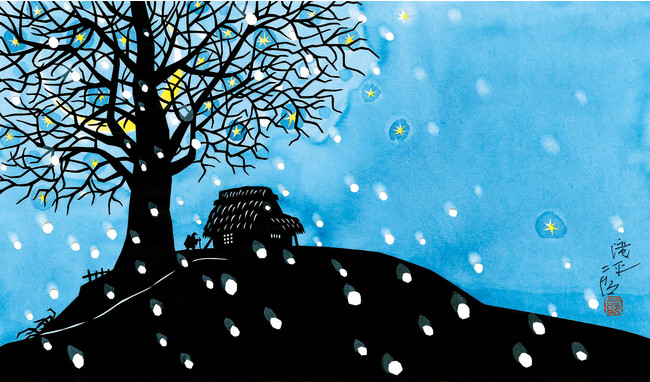1971年の絵本『モチモチの木』発行当時のこの場面が「三日月」だったというエピソードはあまり知られていません。版を重ねる中で「科学的におかしい」との指摘を受け、文・絵ともに変更することになったのです。滝平は元の絵を廃棄して心機一転描き直そうとしましたが、「捨てるくらいなら私にください」と妻に止められ、サインと落款を入れて妻に預けました。こうして「三日月」の絵は廃棄を免れたのです。