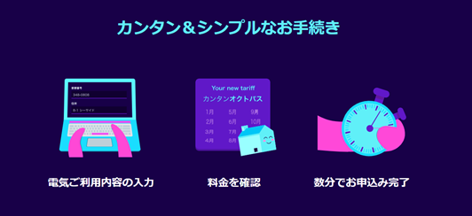 オクトパスエナジーのウェブサイトは、料金シミュレーションが手軽にできるシンプルなつくりです。お申し込み時には、ご自宅の郵便番号を入力してから、料金シミュレーション → 料金プラン選択 → お申し込み手続き、さらにお申し込み後の「マイページ」画面でのご契約内容、料金の確認まで、シンプルでカンタンな一本道のプロセスで完結できます。