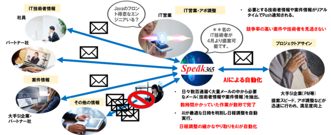 AI・推論エンジンの研究開発を行っているソプラ株式会社(本社:大阪市、代表取締役:白川基光、以下ソプラ)は、”自然言語解析&AIアルゴリズムの構築”に特化した独自のAI技術により、 Microsoft365のメール・Word・Excel・PowerPoint等々で作成された文章やデータを自然な言葉で抽出する ”AI推論エンジン”を開発致しました。2023年2月より第一弾として日々送られてくる社内通達や営業メール等々の数千・数万通の多種多様な非定形メールを学習しIT技術者情報や案件情報のみを解析、日常の言葉で抽出できるIT業界に特化した音声AIサービス”Speak365(スピーク365)”を開始いたします。