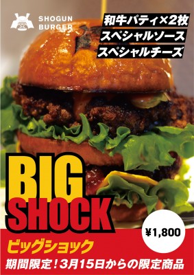 株式会社 ガネーシャ(本社:富山県富山市、代表取締役:本田大輝)が展開するSHOGUN BURGER(https://shogun-burger.com)は、某有名ハンバーガーチェーンの人気商品をオマージュした《BIG SHOCK》を2022年3月15日~2022年4月15日の期間限定で、新宿総本店・渋谷店・町田店・秋葉原店・富山店・金沢店の全店舗にて発売を開始致しました。