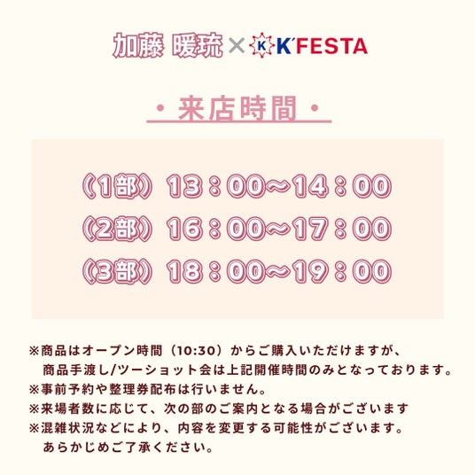 イベント当日、"加藤暖琉"×K'FESTAコラボグッズ1点を含む合計¥3,000以上(税込)お買い上げの方は、"加藤暖琉"さんとツーショット撮影いただけます。