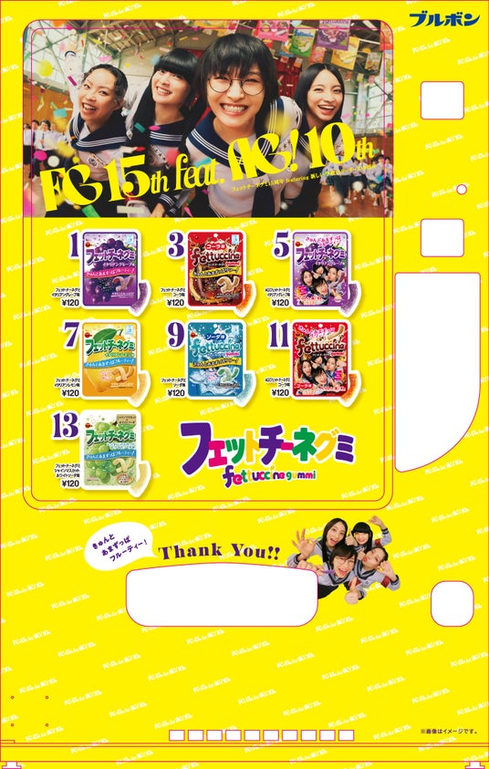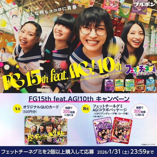 また、CMの公開にあわせ、フェットチーネグミを購入すると、15周年を記念したオリジナルQUOカードやAG!コラボパッケージのフェットチーネグミが当たるマストバイキャンペーンも実施。AG!コラボパッケージは、2026年2月17日(火)より一般発売も予定しています。一般発売に先立ち、JR柏崎駅の待合室に設置されている自動販売機「プチモール」にて先行発売もいたします。