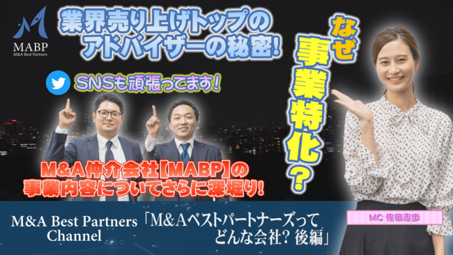 株式会社M&Aベストパートナーズ(本社:東京都千代田区、代表取締役社長:齋藤 達雄 以下M&Aベストパートナーズ)は、この度YouTubeチャンネルを開設したことをお知らせいたします。今後、M&Aに関することや、当社で働くアドバイザーに関することなど、様々な情報を配信してまいります。