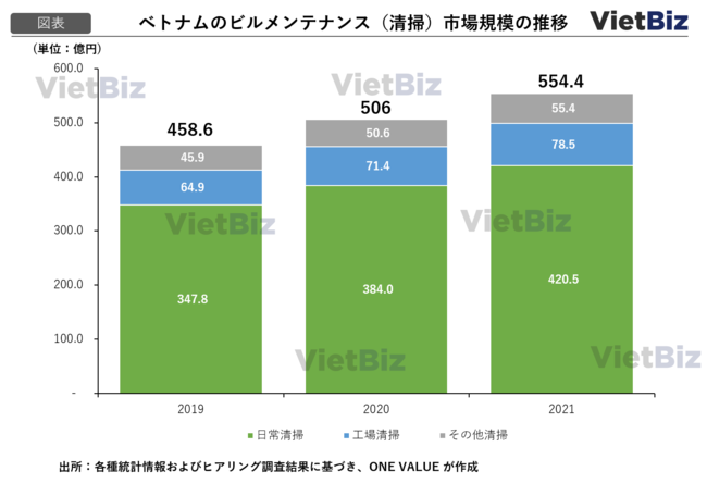 ONE-VALUE株式会社の調査によると、2020年のベトナムにおけるビルメンテ市場の規模は500億円に達しています。