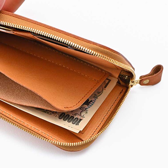 L型財布ricchyL[リッチーL]は、1万円札がギリギリ入る大きさで作られたコンパクトな長財布です。「長財布なのにスリムでコンパクト」を叶えるために小銭入れにファスナーを付けずに作りました。