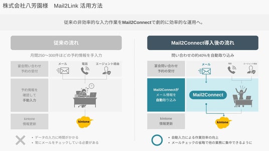 ハウスウェル株式会社(埼玉県さいたま市大宮区、代表取締役:天池健二)は、メールをチャットツールに自動転送する「Mail2Link(メールトゥーリンク)」のオプション機能である「Mail2Connect」を利用し、株式会社八芳園様(東京都港区白金台、代表取締役 会長 : 長谷晴義)の宴会予約メールの自動kintone取り込みを実現し、入力効率を40%向上させたことを発表いたします。