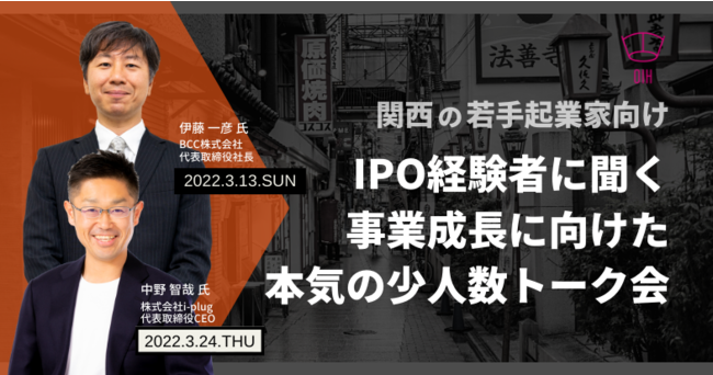 大阪・関西におけるスタートアップ・エコシステムの構築をミッションとする大阪イノベーションハブ(OIH)は、若手起業家向け支援メニューとして初めての取り組みとなる起業家トーク会を開催します。第1回はBCC株式会社 代表取締役社長 伊藤 一彦氏、第2回は株式会社i-plug 代表取締役CEO 中野 智哉氏をお招きし、少人数制の濃密ながらカジュアルに話せるイベントとなります。2月3日(木)より申し込みの受け付けを開始しました。