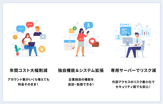 1,000アカウントでも1万アカウントでもアカウント数の上限なく、同一コストで運用可能。グループ会社・海外支社を含めた全社利用に最適です。さらに、専用サーバーを企業ごとに構築することで、外部アクセスリスクを最小化。セキュリティ面でも高い信頼性を確保しています。