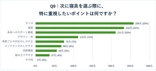 「Q9.次に寝具を選ぶ際に、特に重視したいポイントは何ですか?(最大3つまで選択可能)」との質問に対し、結果は次のようになりました。