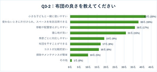 布団の良さとしては「小さな子どもと使いやすい」という回答が最も多く、次いで「使わないときに片付けられ、スペースを確保できる」「移動や配置替えがしやすい」という回答が多く見られました。