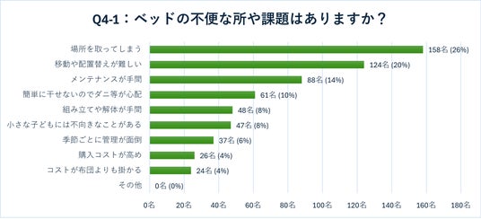 「Q4-1.“ベッド”と答えた方へ ベッドの不便なところや課題はありますか?(最大3つまで選択可能)」との質問に対し、結果は次のようになりました。