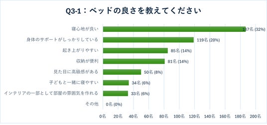 「Q3-1.“ベッド”と答えた方へ ベッドの良さを教えてください(最大3つまで選択可能)」との質問に対し、結果は次のようになりました。