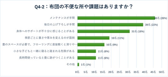 「Q4-2.“布団”と答えた方へ 布団の不便なところや課題はありますか?(最大3つまで選択可能)」との質問に対し、結果は次のようになりました。