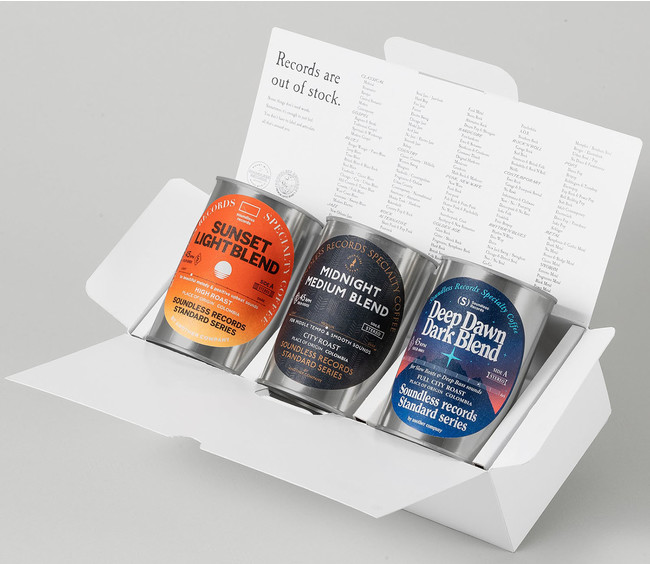 「サウンドレスレコーズ」のスペシャルブレンドシリーズ。苦味や酸味、ナッツの風味、フルーティーさ等で表現するだけでなく、さらに音楽のジャンルやストーリーを組み合わせて表現しました。