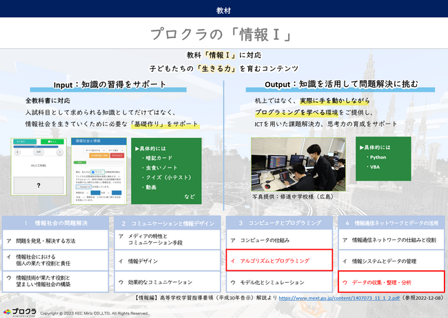 「プロクラ情報I」は、生徒さんの主体的な学習を促進し、膨大な範囲を有する情報Iの科目を楽しく、効率的に学習することができる新しいコンテンツです。私たち株式会社KEC Mirizは、今後もより良い学習環境の提供に努めてまいります。
