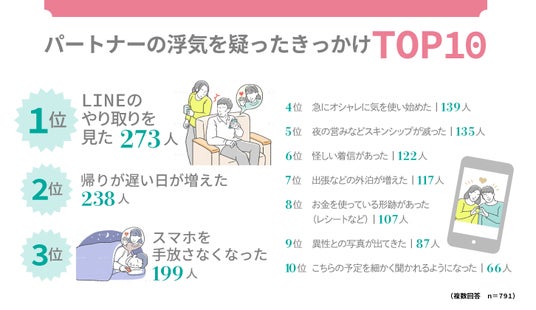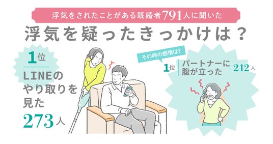 浮気をされたことがある既婚者男女791人に「浮気を疑ったきっかけ」や「証拠を調べた方法」について聞いたところ、いずれもLINEに関する回答が多いという結果になりました。