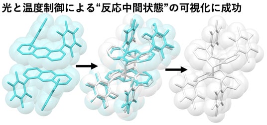 - 1.の結果、反応速度を大幅に低下させることが可能となり、反応途中の中間状態の分子構造を単結晶X線構造解析(*2)により可視化することに成功しました。これは、世界初の事例です。