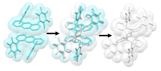 研究グループは、この固溶体を単結晶X線構造解析することにより、反応途中の分子の三次元配置を明らかにしました(図3)。これは、反応過程そのものを「見える化」した画期的成果であり、150年以上にわたるアントラセン光反応研究の中心課題に対する決定的な一歩となります。