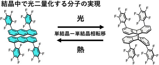 本研究は、高知工科大学の樋野 優人さん(博士後期課程2年)、松尾 匠助教、林 正太郎教授の研究グループが行ったもので、同グループは、これまで結晶学的に精密設計したアントラセン誘導体に着目し、これまでに結晶光化学の新領域を切り開いてきました(*3)。今回は、このアントラセン[4+4]光環化付加反応について、光と熱という2つの刺激によって反応速度と、反応の開始・停止を自在に制御する“二重制御システム”を構築し、その結果、反応速度を大幅に遅らせることが可能となり、反応途中の中間状態を世界で初めて直接可視化することに成功しました。